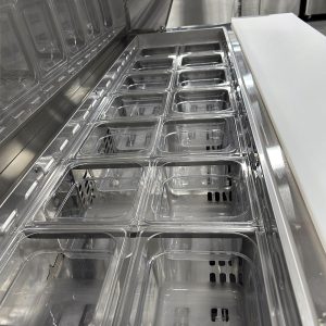 - ➤ Phần khay GN 1/3 (có nắp đậy): Dùng để trưng bày hoặc cất giữ nguyên liệu như salad, topping, rau củ,… thuận tiện khi thao tác chế biến.