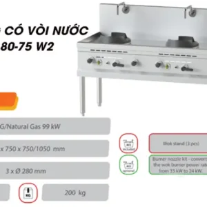 - 🔸 3 họng đốt công suất lớn: Mỗi họng có đường kính Ø280mm, sử dụng đầu đốt phản lực với công suất 33kW/họng, giúp tạo ngọn lửa lớn, ổn định – lý tưởng cho các món xào, luộc, chiên, hấp,…