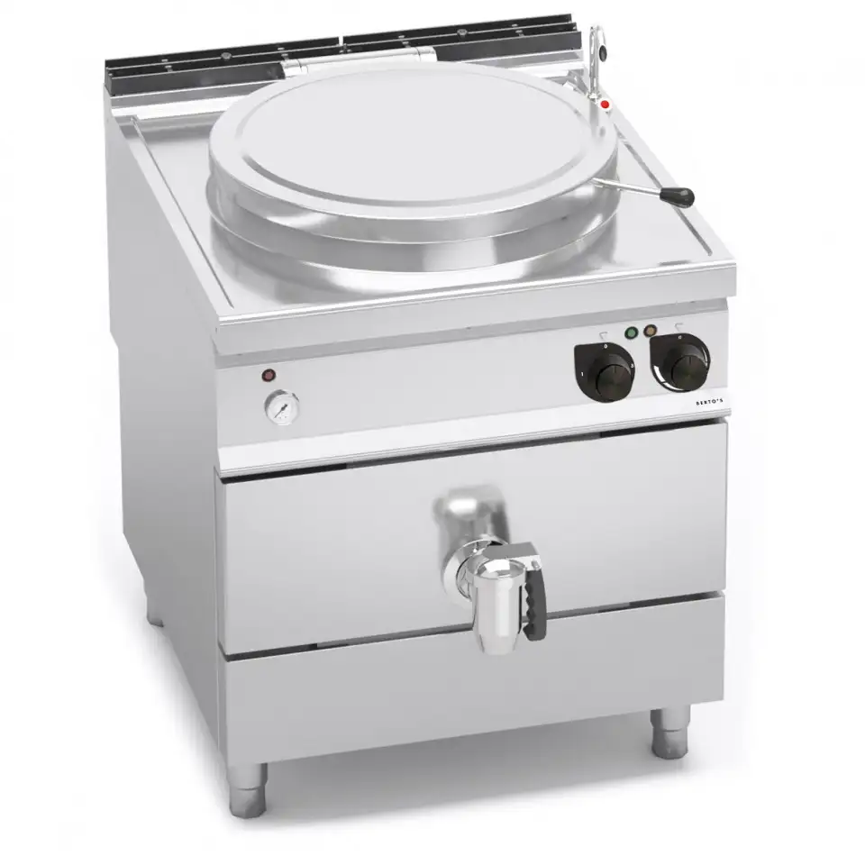 Berto’s E9P15I là mẫu chảo đun sôi điện công nghiệp 150 lít, sử dụng hệ thống làm nóng gián tiếp bằng hơi nước áp suất thấp – giải pháp nấu nướng hiệu quả và an toàn tối ưu cho các khu bếp lớn như: