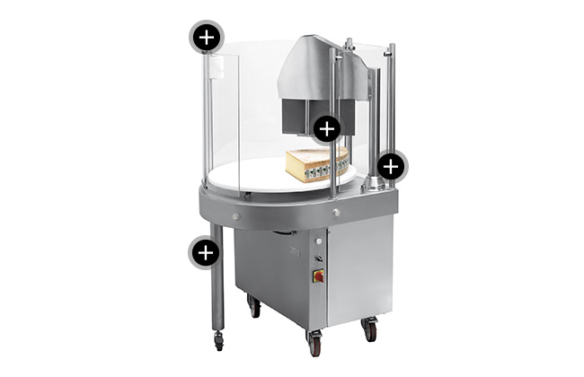 Máy sử dụng lưỡi dao sắc bén dài 375 mm, giúp cắt phô mai cứng một cách dễ dàng, nhanh chóng và đồng đều. Đường cắt mịn, ít vụn, giữ nguyên hình dạng miếng phô mai.