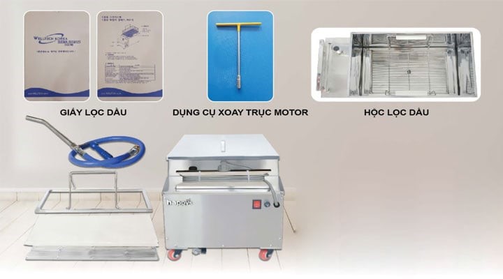 - Lọc 100% cặn và tạp chất: Máy giúp loại bỏ hoàn toàn các tạp chất cháy trong dầu, đảm bảo dầu đạt độ trong và màu sắc đẹp, giữ lại hương vị nguyên bản của thực phẩm.