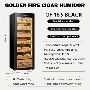 Trong thế giới ấy, Tủ bảo quản xì gà Golden Fire GF 163 Black chính là lựa chọn lý tưởng dành cho các tín đồ yêu cigar chân chính, cả về chất lượng lẫn đẳng cấp.