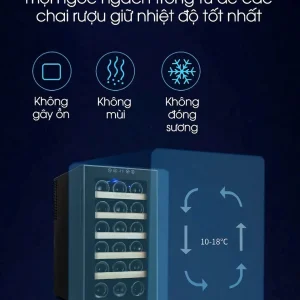 - 🌬 Công nghệ làm mát bằng chip điện tử hiện đại giúp vận hành êm ái, không gây tiếng ồn, không rung lắc – tạo môi trường lý tưởng để rượu “nghỉ ngơi” và phát triển hương vị.