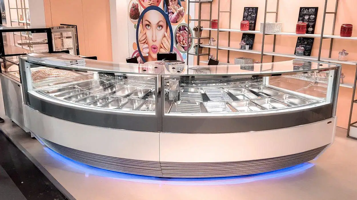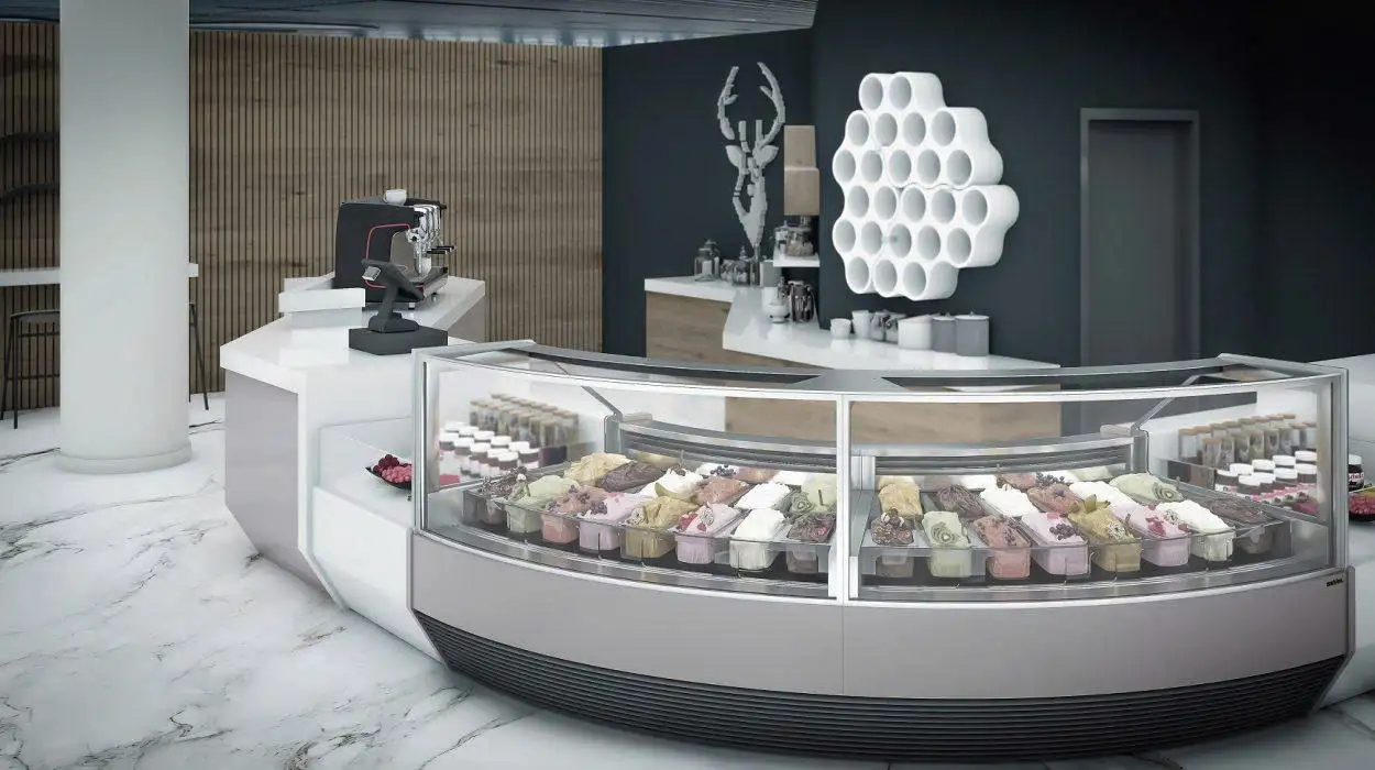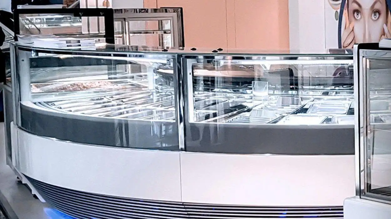 Một chiếc tủ kem hiện đại cần kính chống đọng nước, trong suốt và bền bỉ. S45 đáp ứng xuất sắc.