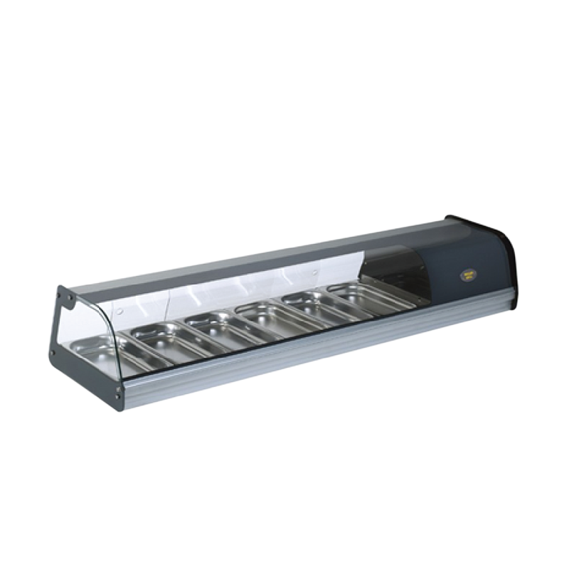 Cấu trúc tủ dạng nằm ngang nhỏ gọn, dễ dàng lắp đặt trên quầy bar hoặc quầy chế biến sushi mà không chiếm nhiều diện tích, tạo nên một không gian vừa tiện lợi vừa bắt mắt.